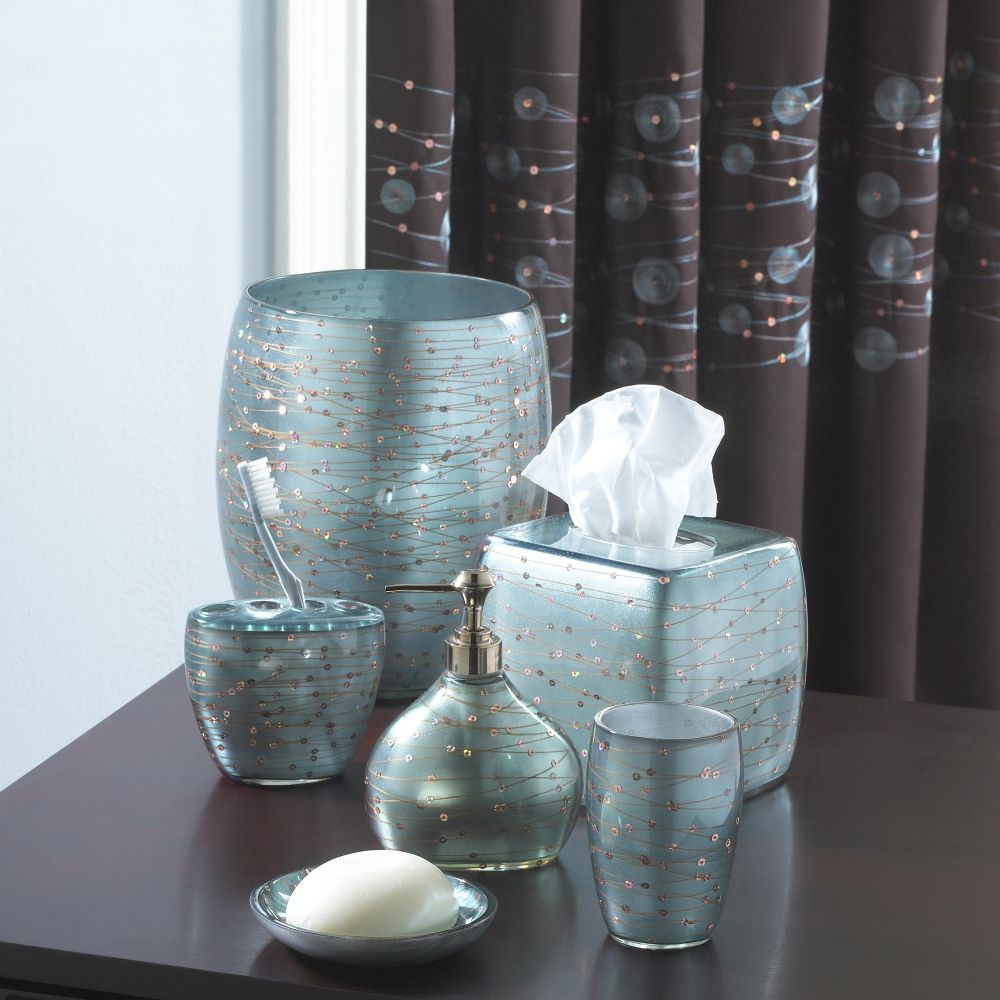 Find true glamour with Pizzazz's exclusive detailing in which strands of interlaced, threaded, reflective sequins are wrapped around transparent resin bodies. These uniquely fabricated forms radiate with an iridescent finish, and a clear resin layer sealed on the inside.The collection includes a lotion bottle, tumbler, soap dish, toothbrush holder, tissue cover, wastebasket, and shower hooks. Coordinating textiles complete the collection.