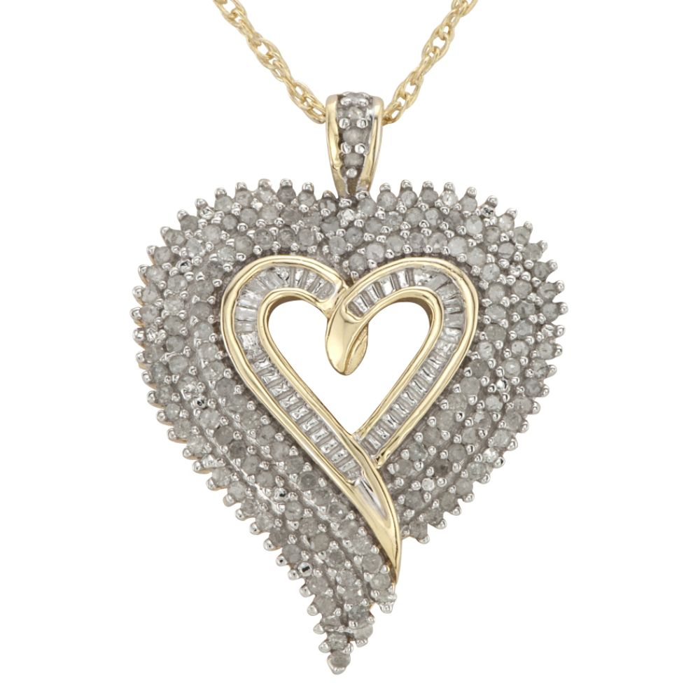 There is no more obvious way to show your love for her than this extraordinary diamond heart pendant. 1 carat of gleaming diamonds are set in 14k gold over sterling silver for a classic, eye-catching look. There will be no mistake that love is behind this beautiful heart. Hangs beautifully from an 18" rope chain for perfect placement. Holds securely with spring ring clasp closure.