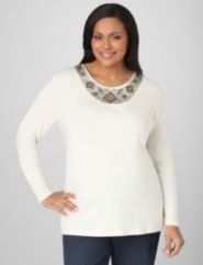 Geometric designs, created by bronzetone and pewtertone sequins and beads, cover the curved satin yoke of this long-sleeve, scoopneck top. Shirring under yoke for added fullness. Catherines tops are perfectly proportioned for the plus size woman. (item 123488)
