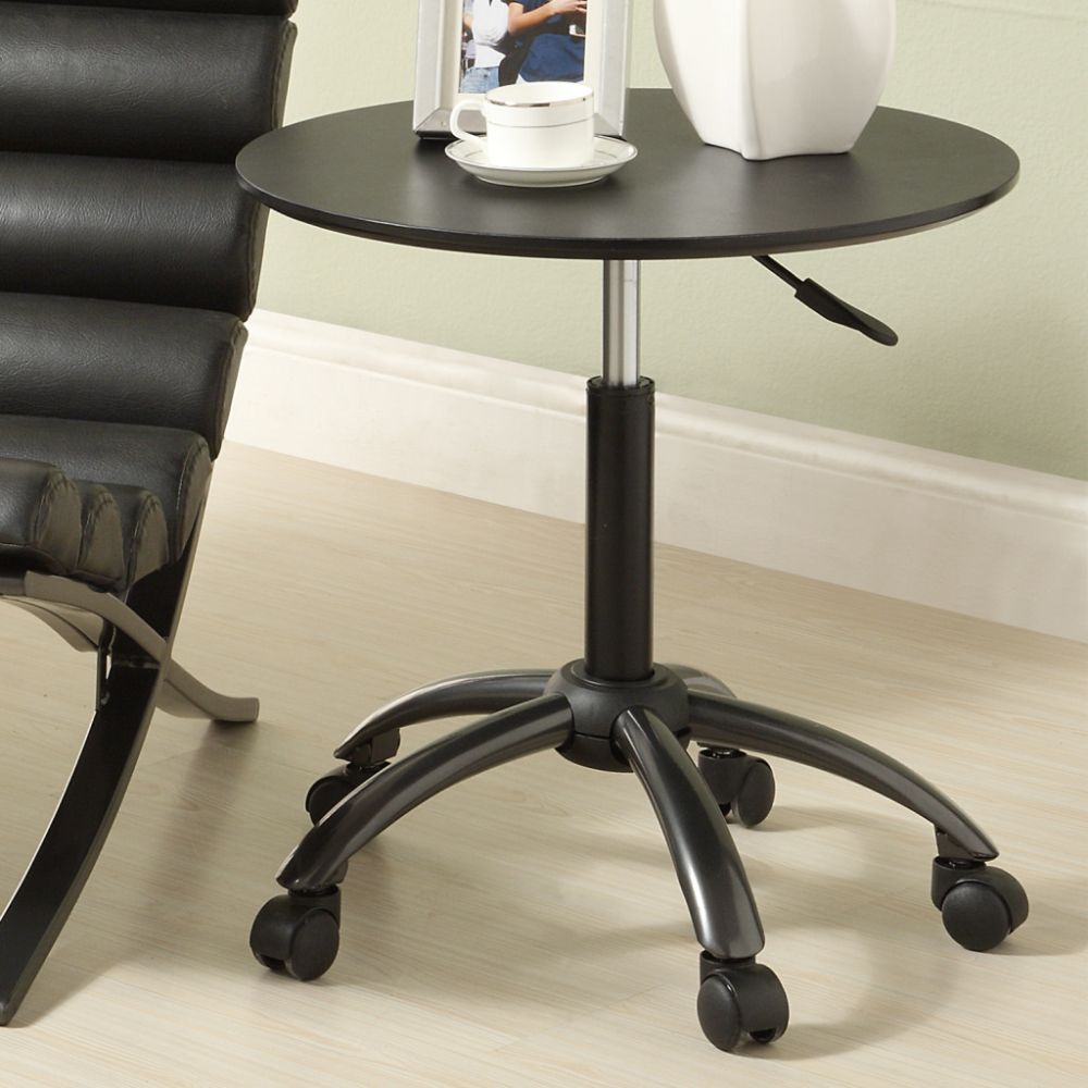 This end table features a modern touch with a gunmetal grey powder-coat finish. This end table features caster legs for added convenience in moving around. Materials: Metal, chromed. Finish: Gunmetal grey powdercoat. Caster legs. Dimensions: 29.25 inches high x 22 inches in diameter